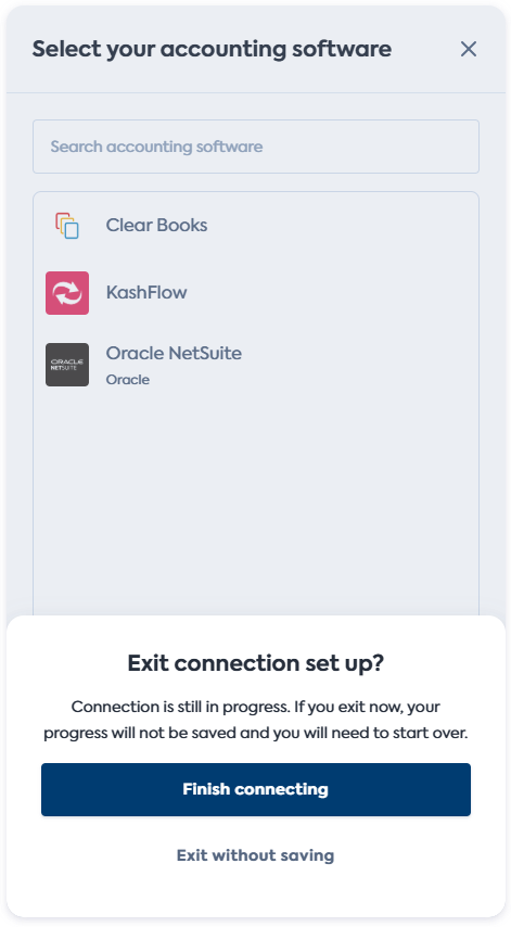 • Exit without saving stops the progress of the connectionConnection A link between a Codat company and a data source (like an accounting platform). Each connection represents authorized access to pull or push data from that platform. flow.